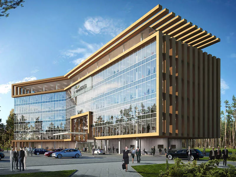 Modernaj oficejaj blokoj kun ŝtala strukturo